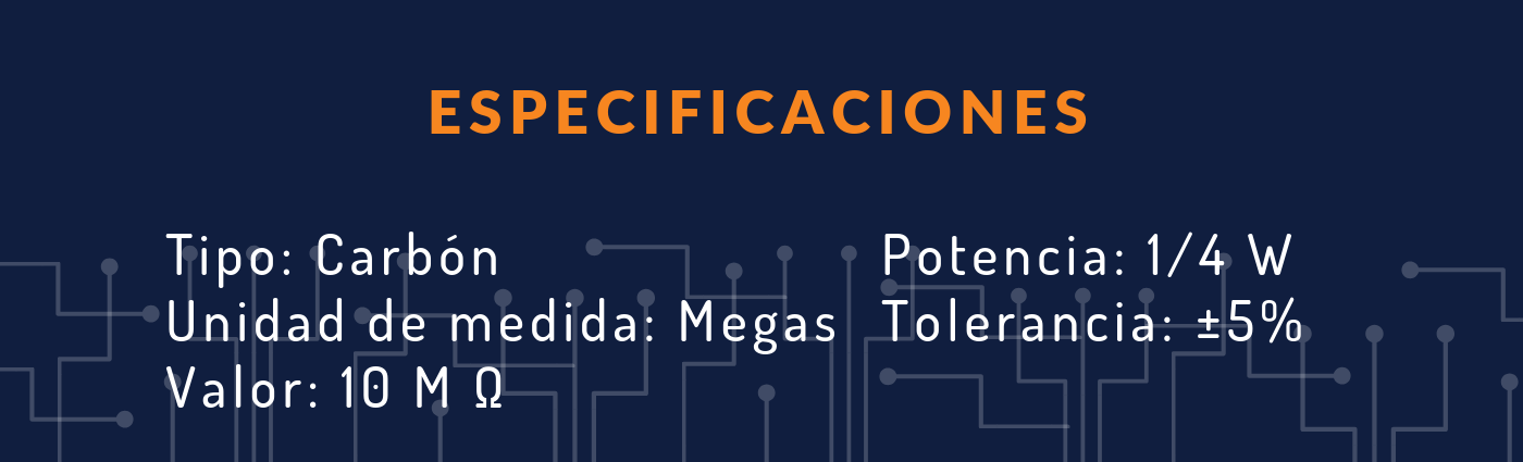 Resistencia de 10 Mega Ohm 1/4 W. actúa para reducir los flujos de corriente y, al mismo tiempo, reduce los niveles de voltaje dentro de los circuitos. En los circuitos electrónicos las resistencias se usan para limitar el flujo de corriente, para ajustar los niveles de señal de los elementos activos de polarización, y para terminar las líneas de transmisión entre otros usos.