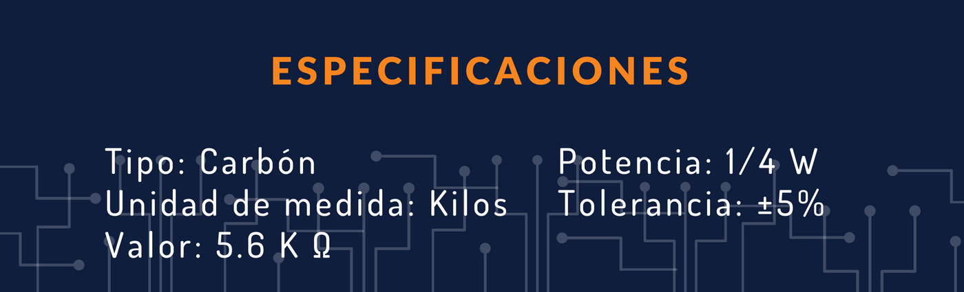 Resistencia de 5.6 Kilo Ohm 1/4 W. actúa para reducir los flujos de corriente y, al mismo tiempo, reduce los niveles de voltaje dentro de los circuitos. En los circuitos electrónicos las resistencias se usan para limitar el flujo de corriente, para ajustar los niveles de señal de los elementos activos de polarización, y para terminar las líneas de transmisión entre otros usos.