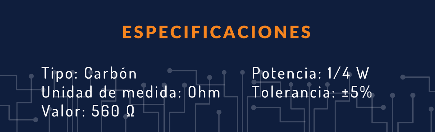 Resistencia de 560 Ohm 1/4 W. actúa para reducir los flujos de corriente y, al mismo tiempo, reduce los niveles de voltaje dentro de los circuitos. En los circuitos electrónicos las resistencias se usan para limitar el flujo de corriente, para ajustar los niveles de señal de los elementos activos de polarización, y para terminar las líneas de transmisión entre otros usos.