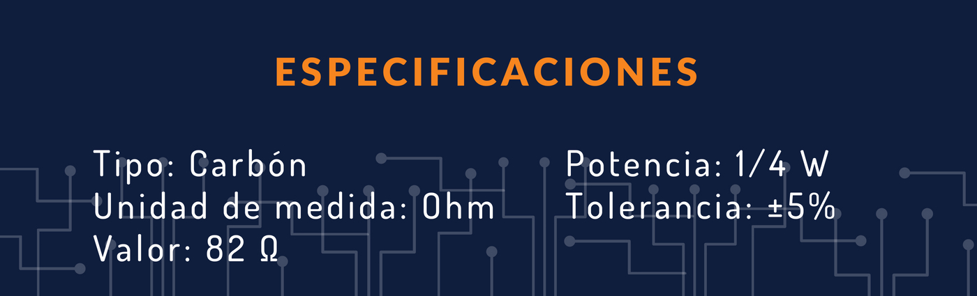 Resistencia de 82 Ohm 1/4 W. actúa para reducir los flujos de corriente y, al mismo tiempo, reduce los niveles de voltaje dentro de los circuitos. En los circuitos electrónicos las resistencias se usan para limitar el flujo de corriente, para ajustar los niveles de señal de los elementos activos de polarización, y para terminar las líneas de transmisión entre otros usos.